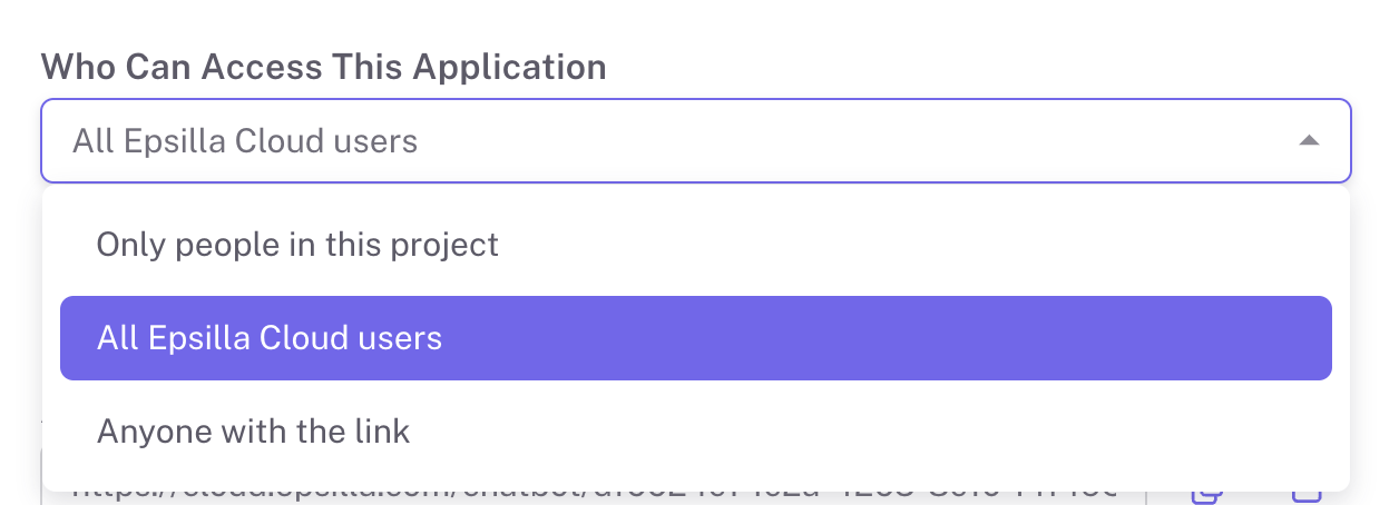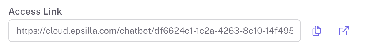 An access link allows you to easily share your AI agent with others based on your selected level of access. Whether it's restricted to project members, available to all Epsilla Cloud users, or open to anyone with the link, the access link provides a convenient way for others to engage with your agent. For broader engagement, you can directly share this link with the community or your intended audience.