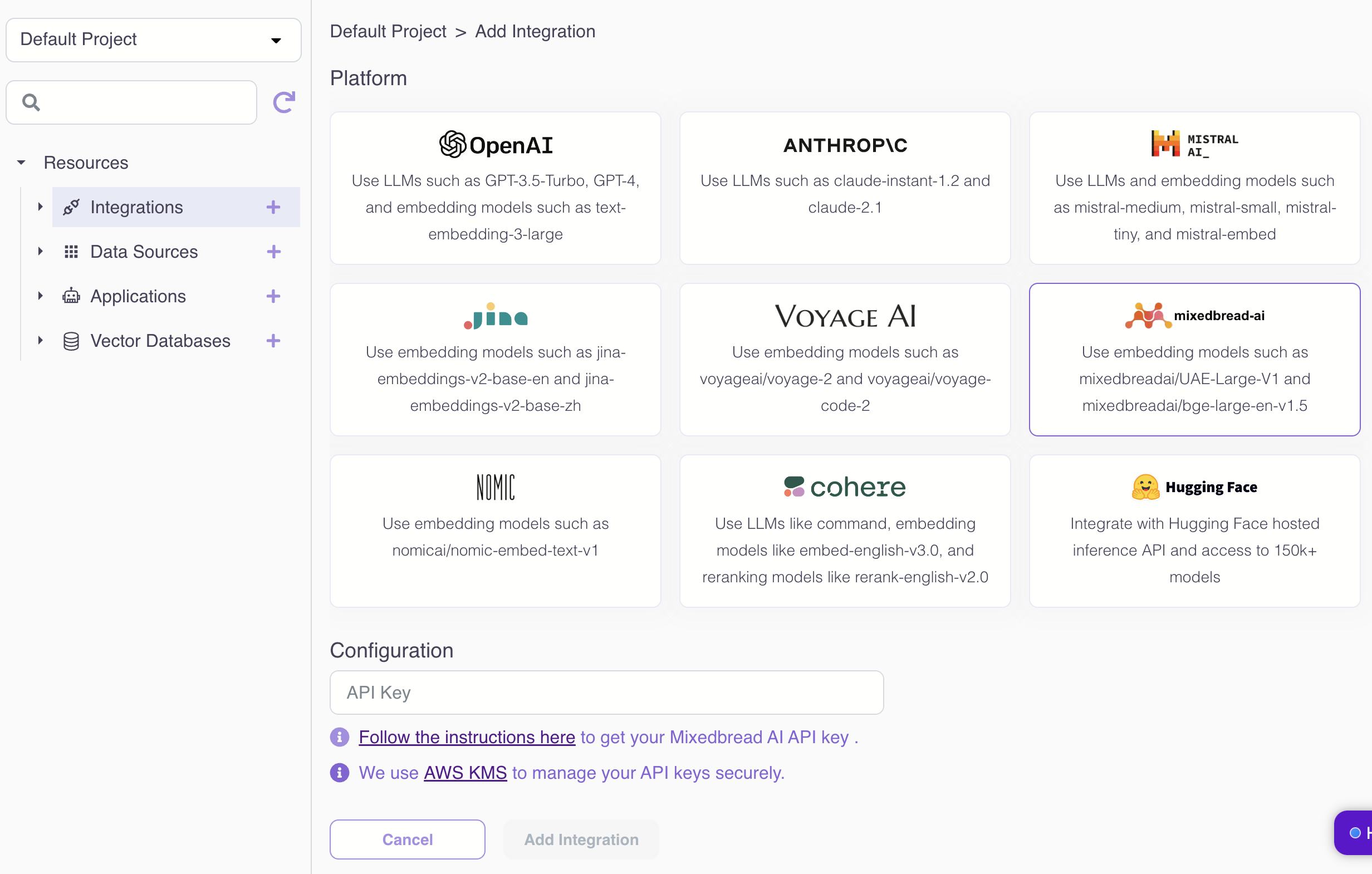 On Epsilla Cloud, you can enable Mixedbread AI integration by providing your Mixedbread AI API key (we securely manage your keys using AWS KMS):