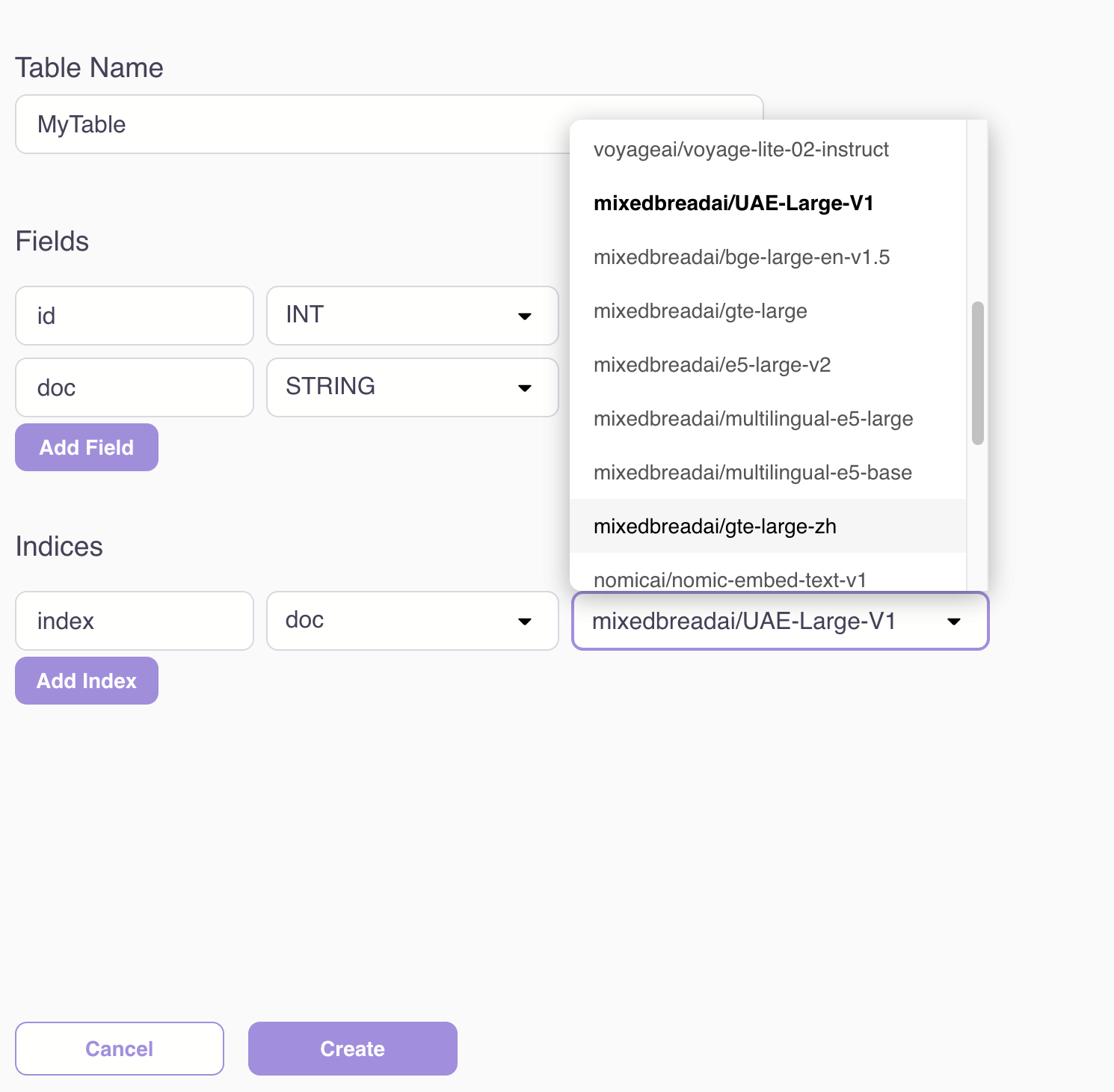Then you can start using the mixedbreadai embedding model during vector table schema creation: