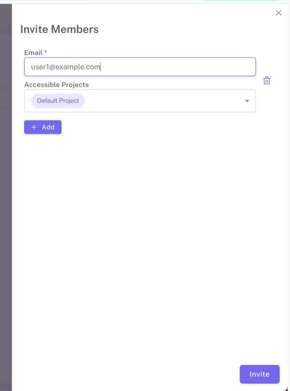 * **Step 2:** A pop-up window will appear. Enter the email address of the member you want to invite in the **Email** field. You can invite more than one users by clicking the **+ Add** button.