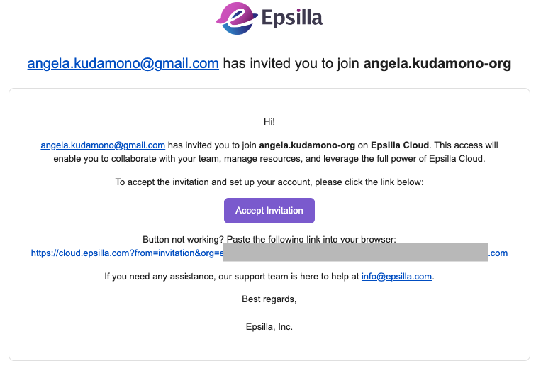 Once an invitation is sent, the invited user will receive an email from Epsilla, like the following: