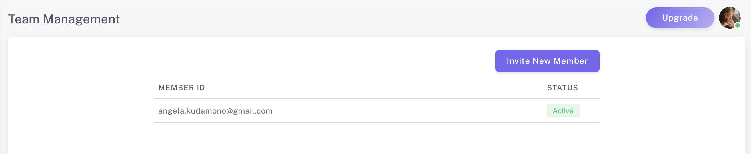 Once in the **Team Management** section, you'll see a list of current team members, with columns displaying their **Member ID** (email) and **Status**.